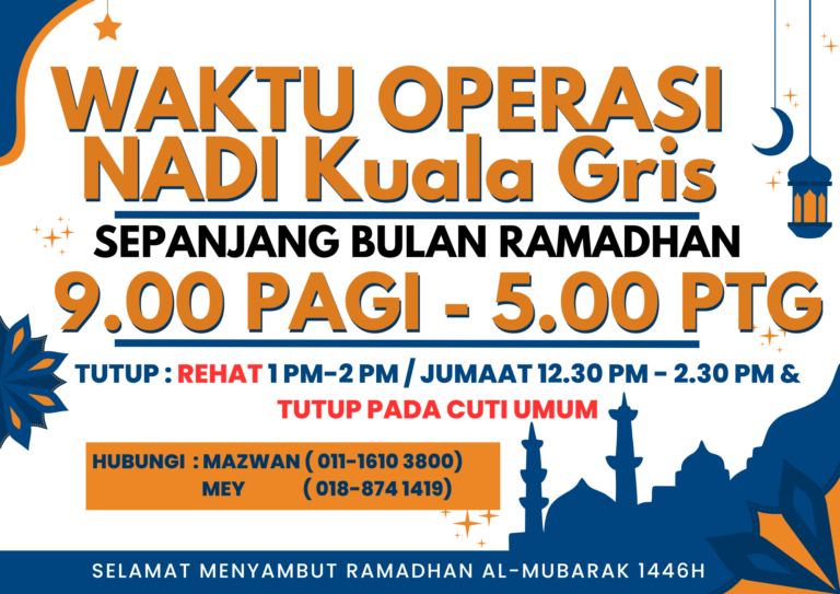 Untuk makluman, berikut merupakan notis waktu operasi NADI Kuala Gris sepanjang bulan Ramadhan.9.00 pagi β 5.00 petangWaktu RehatSabtu-Khamis : 1.00-2.00 petangJumaat : 12.30-2.30 petang..NADI akan beroperasi setiap hari kecuali cuti umum..“Selamat Menyambut Ramadan Al-Mubarak”.